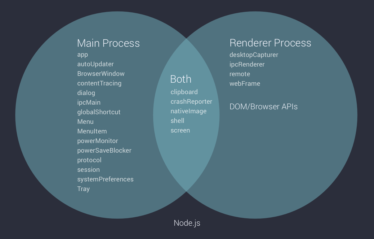 Electron 是基于 Chromium 和 Node.js 构建 App 的,这意味着 Chromium 原生的设计也会被带到 Electron 里,比如在 Chromium 里每一个 tab 或 web 页面都是 webContents 的实例,所有的 DOM APIs、Node.js APIs、Electron APIs 都可用于渲染进程,如下图所示: