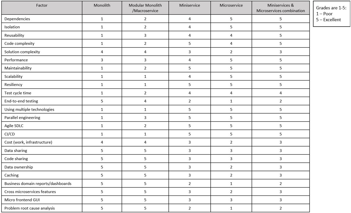 作者在这篇文章中介绍了什么是单体模块化架构(也称为 macroservices)、迷你服务和微服务,以及它们的优势和劣势,并总结成了一张图: