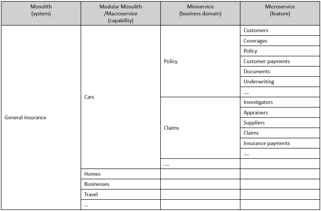 - 混合拆分 - 结合水平拆分和垂直拆分,如客户一般是通用的,拆分为微服务;而汽车保单基本和人寿、家庭等没有共同之处,则将它们拆分为迷你服务