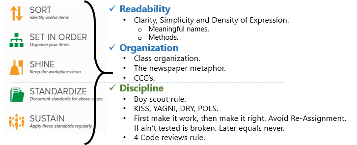 如何实现 Clean Code,或者说它的评估标准有哪些,这里展示一张网络上的图,通过它很容易判断项目当下 Clean Code 的级别以及需要思考改进的方向: